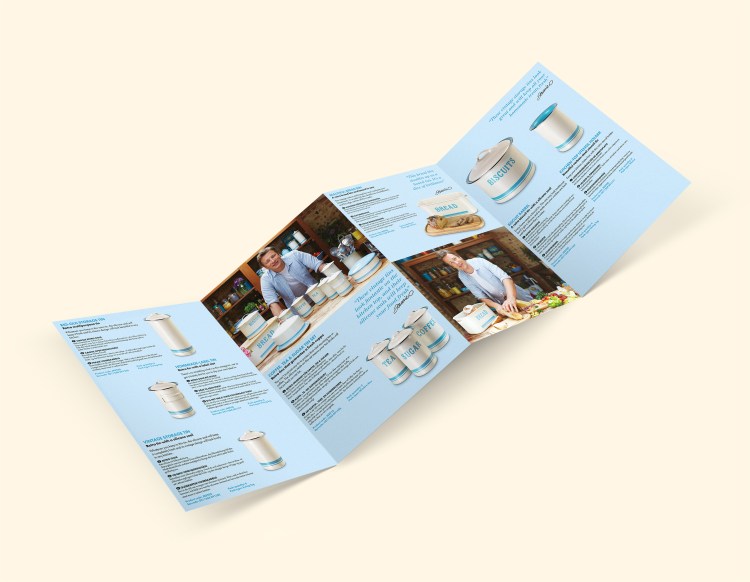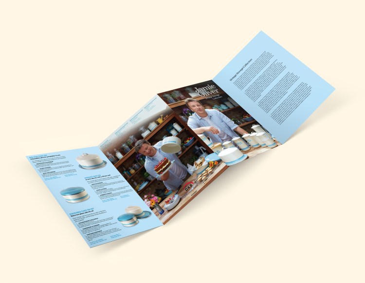 A folding booklet created following brand guidelines, showcasing a range of Jamie Oliver branded products.
